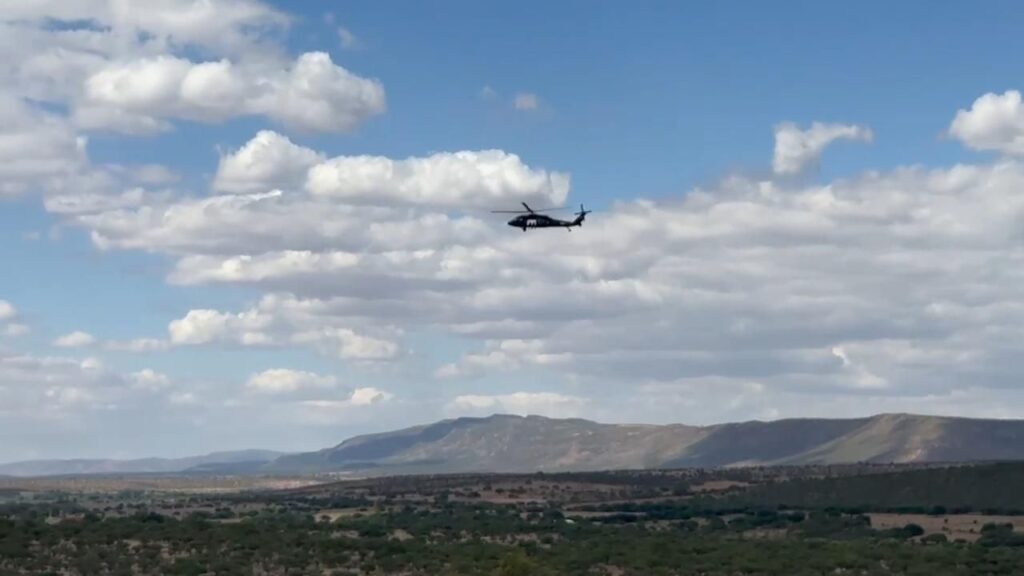 Los helicópteros BlackHawk y El Cuervo, de la secretaría de Seguridad Pública, se encuentran sobrevolando el área y repeliendo las balas desde el aire.