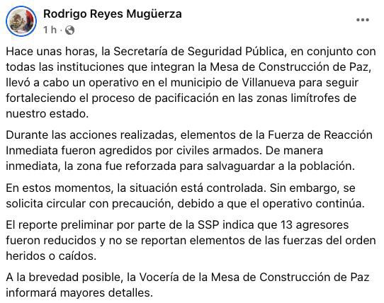 Rodrigo Reyes, secretario de seguridad, publicó en redes sociales un mensaje en el que señala que: “La situación está controlada. Sin embargo, se solicita circular con precaución, debido a que el operativo continúa”, asimismo, aseguró que la Vocería de la Mesa de Construcción de Paz dará más detalles del enfrentamiento.