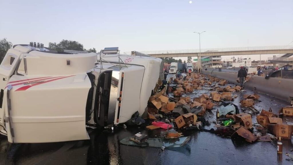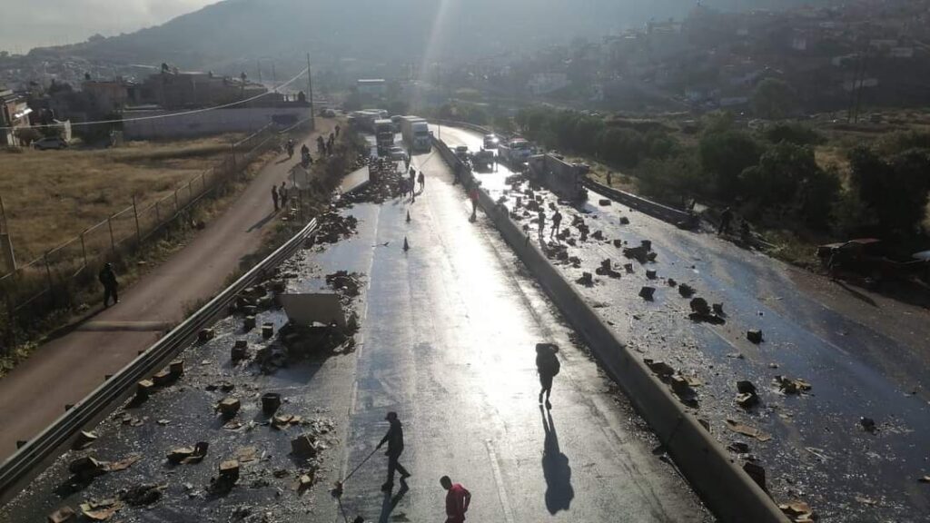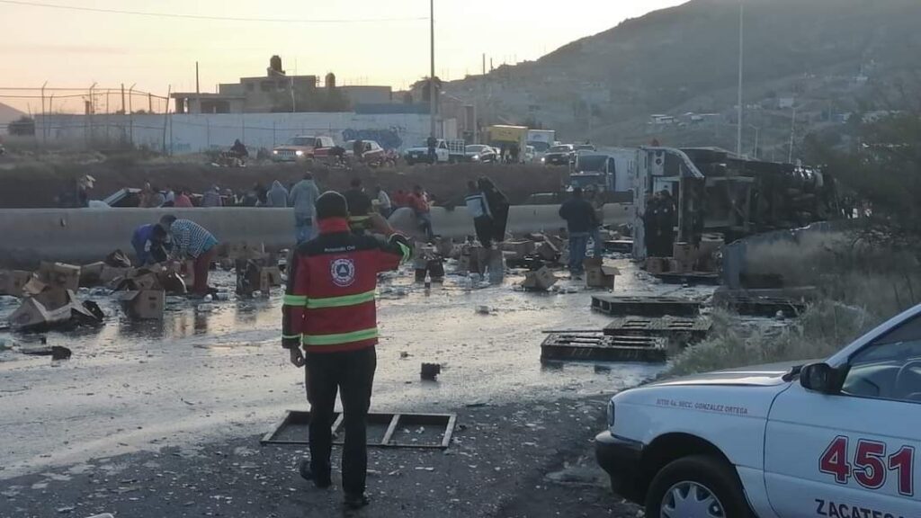 Zacatecas, México, 30 de octubre de 2023 – Un camión quinta rueda que transportaba cerveza se volcó la mañana de este lunes en el bulevar Bicentenario, en la capital del estado. La mercancía fue rapiñada por decenas de personas que se percataron del accidente.