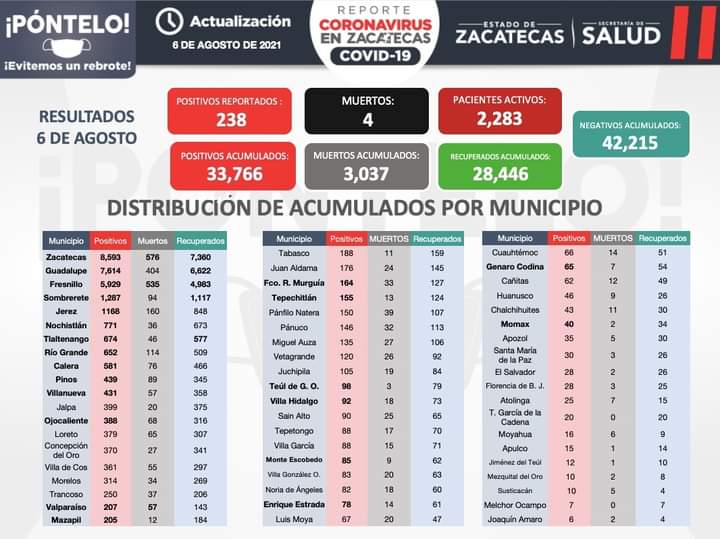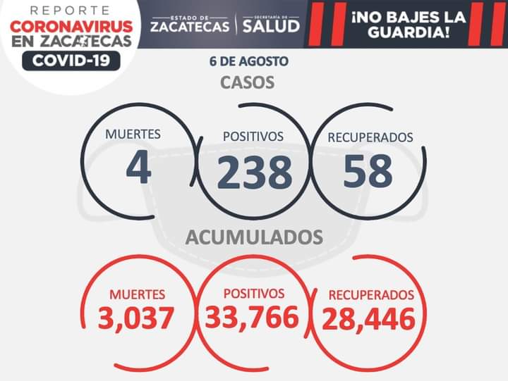 Zacatecas, Zac., 06 de agosto de 2021.- Este viernes, la Secretaría de Salud de Zacatecas (SSZ) registró cuatro fallecimientos y 238 nuevos contagios de COVID-19, así como 58 pacientes recuperados.