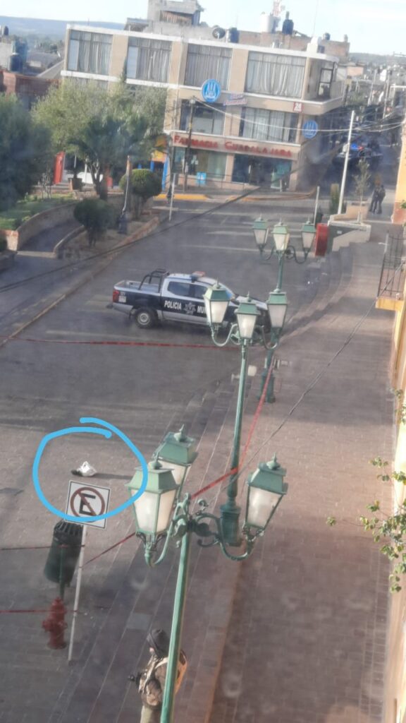El hallazgo ocurrió minutos antes de las 07:00 horas de este martes en la plaza principal, cuando personas que pasaban por el lugar se percataron de una bolsa plástica color negra, además de una cartulina con un mensaje.