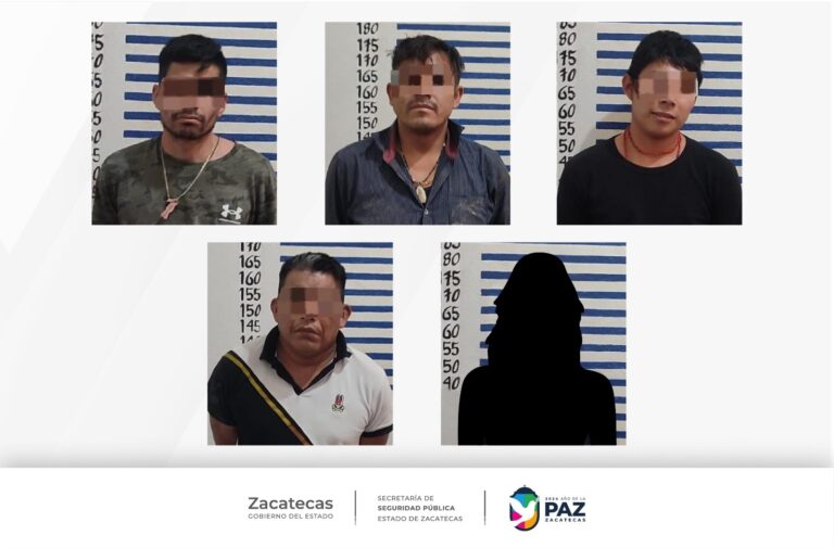 Calera, Zacatecas - En una efectiva acción conjunta, elementos de la Fuerza de Reacción Inmediata (FRIZ) de la Policía Estatal Preventiva, en colaboración con el Ejército Mexicano y la Guardia Nacional, desarticularon una célula delictiva y detuvieron a cinco personas en la colonia El Lago del municipio de Calera.