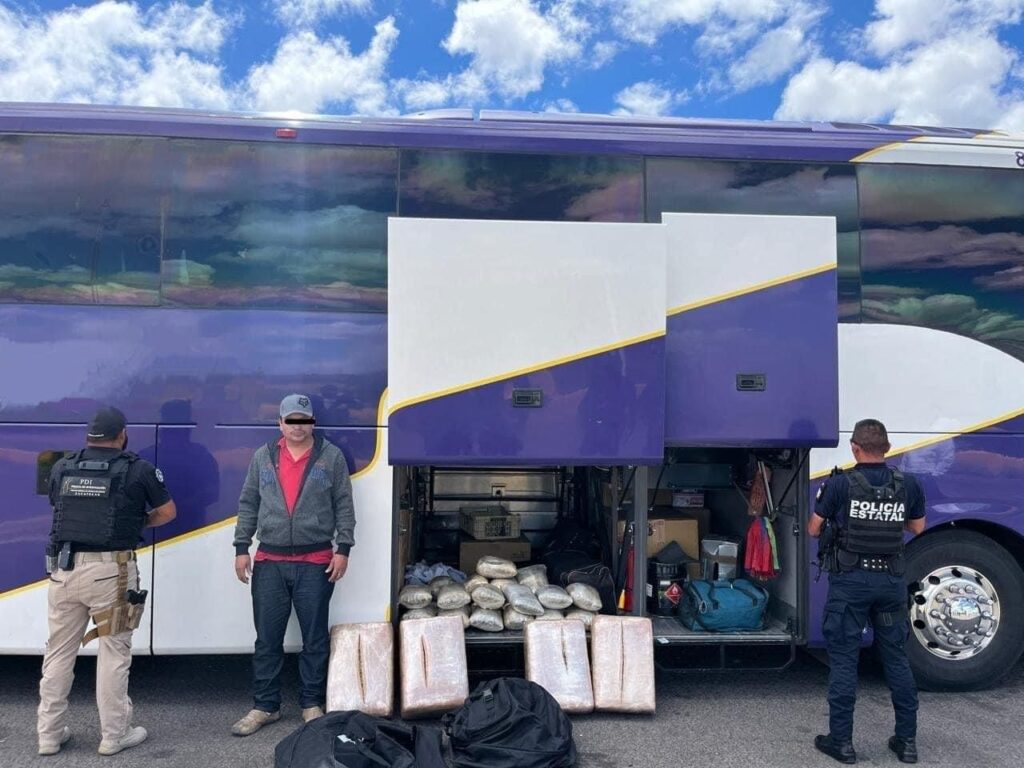 La detención ocurrió en la carretera federal 54, cerca de la UNIRSE de Villa de Cos, Zacatecas. Con la ayuda de un binomio canino, los agentes encontraron 22 paquetes de narcótico, con un peso bruto aproximado de 55 kilogramos de marihuana.