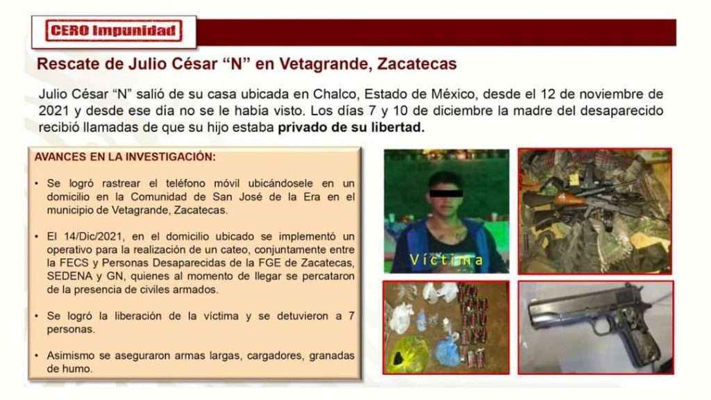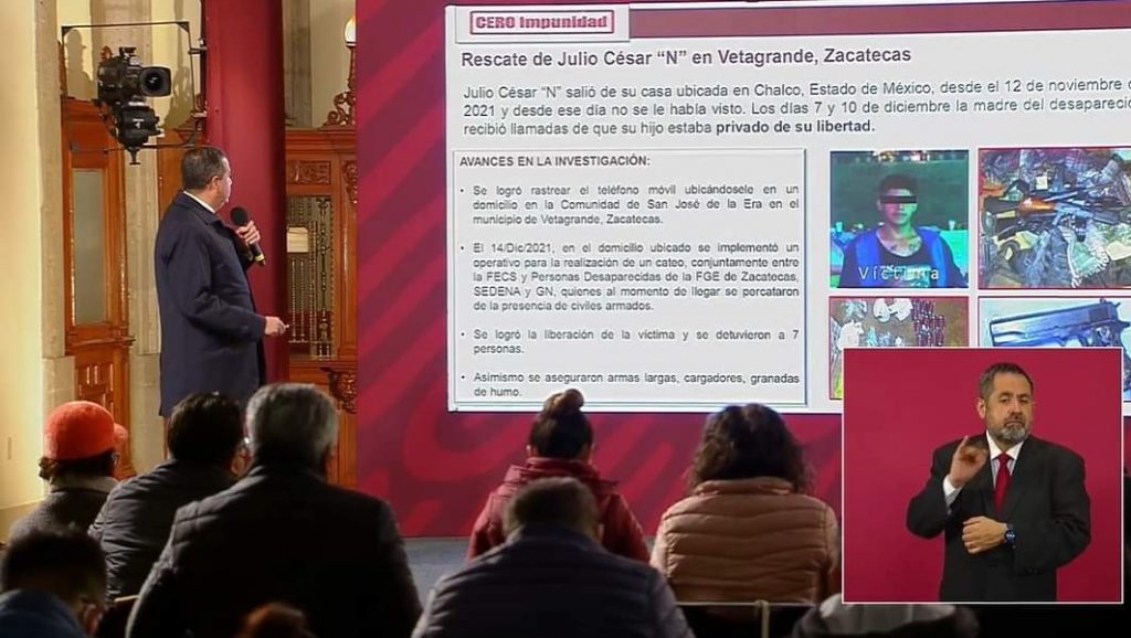 CDMX.- El subsecretario de Seguridad Pública del gobierno de México, Ricardo Mejía Berdeja, informó esta mañana sobre el rescate del joven Julio César «N», en Vetagrande, Zacatecas, el cual era víctima de secuestro.