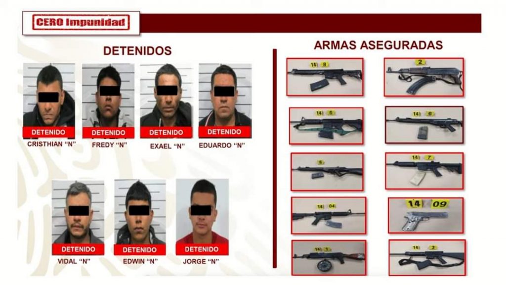 Además , siete personas fueron detenidas Cristhian «N», Fredy «N», Exael «N», Eduardo «N», Vidal»N», Edwin «N» y Jorge «N», asimismo, se les aseguraron armas largas, cargadores y granadas de humo.