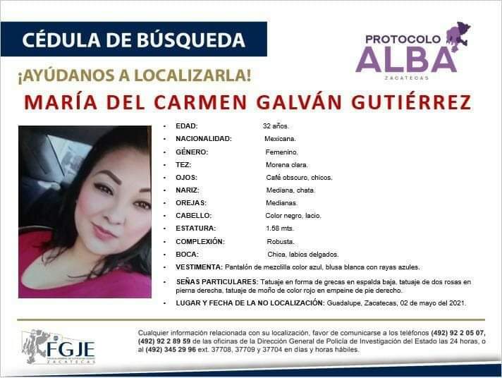 VETAGRANDE, ZACATECAS. Carmen Galván Gutierre de 32 años, era madre de tres hijos y estaba casada.