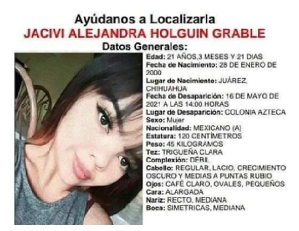 Ciudad Juárez.- La familia, confirmó que la joven que fue . semienterrada en el Kinder Beatriz Sahagún Méndez, de la colonia El Mirador, es Jacivi Alejandra Holguín Grable.