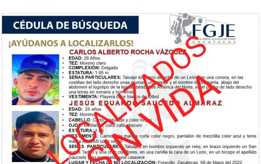 De acuerdo con información de las autoridades se trató de Carlos Alberto Rocha de 26 años de edad y de Jesús Eduardo Saucedo de 25, quienes habían desaparecido desde el 8 de mayo del presente año, por lo que ya se había emitido una ficha para su localización.