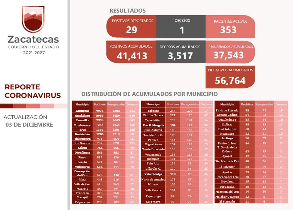 La Secretaría de Salud de Zacatecas (SSZ) reportó, que 29 zacatecanos se contagiaron del virus y una persona que falleció por complicaciones derivadas del mismo.