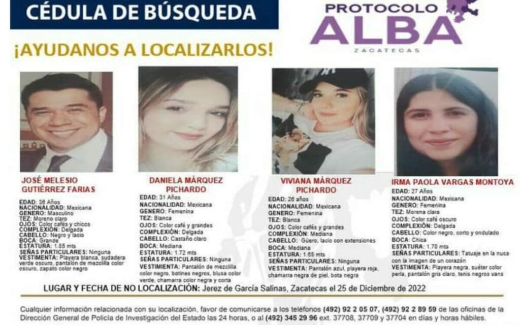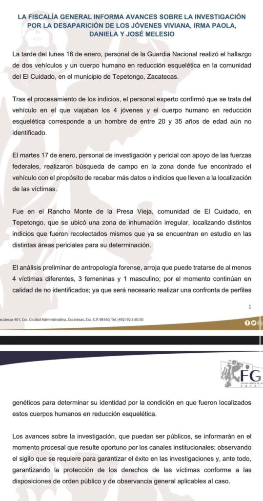 El martes 17 de enero, personal de investigación y pericial con apoyo de las fuerzas federales, realizaron búsqueda de campo en la zona donde fue encontrado el vehículo con el propósito de recabar más datos o indicios que lleven a la localización de las víctimas.