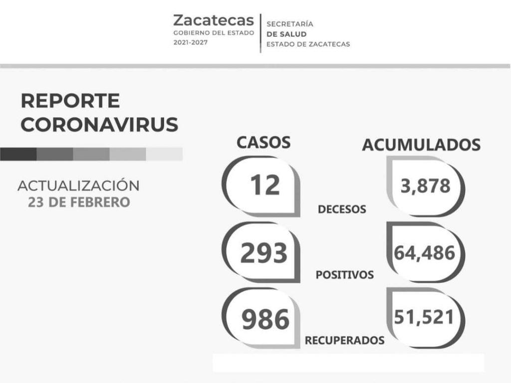 La Secretaría de Salud de Zacatecas (SSZ) informó que el acumulado en este rubro es de 51 mil 521. En tanto que los casos positivos fueron 293 y los decesos 12, reportados en las últimas 24 horas.