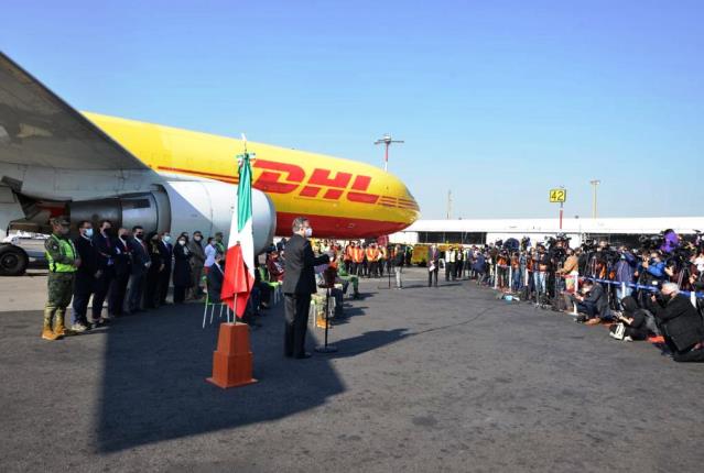 El primero de varios cargamentos de vacunas se recibió en la zona de carga del Aeropuerto Internacional de la Ciudad de México “Benito Juárez”. Será resguardado por elementos de la Secretaría de la Defensa Nacional desde su llegada y hasta su aplicación.