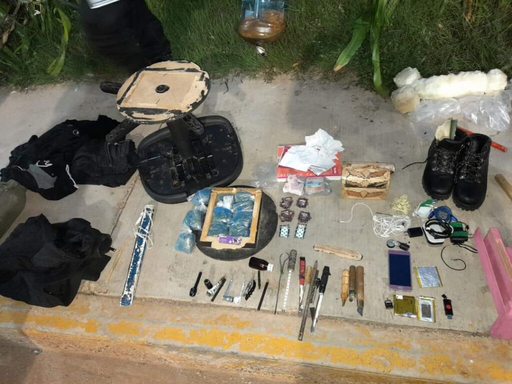 Así como cuatro cargadores para celular con cables completos, dos manos libres, un cable de teléfono, una máquina de tatuar hechiza, 10 pipas hechizas, ocho puntas, tres charrascas, ocho prendas de vestir color negro, cinco pesas hechizas y 20 litros de líquido fermentado.