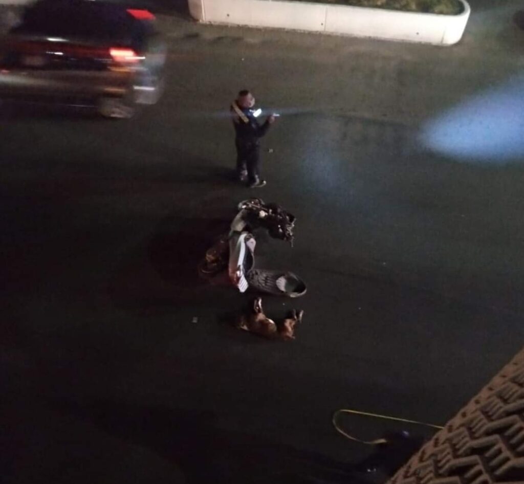 ZACATECAS. – La noche de este miércoles, minutos antes de las diez de la noche, dos hombres que viajaban a bordo de una motocicleta, se impactaron con un perro que atravesaba los carriles sobre del boulevard López Mateos, dirección Gpe-Zac., a la altura del Banco Banorte. Accesozac.