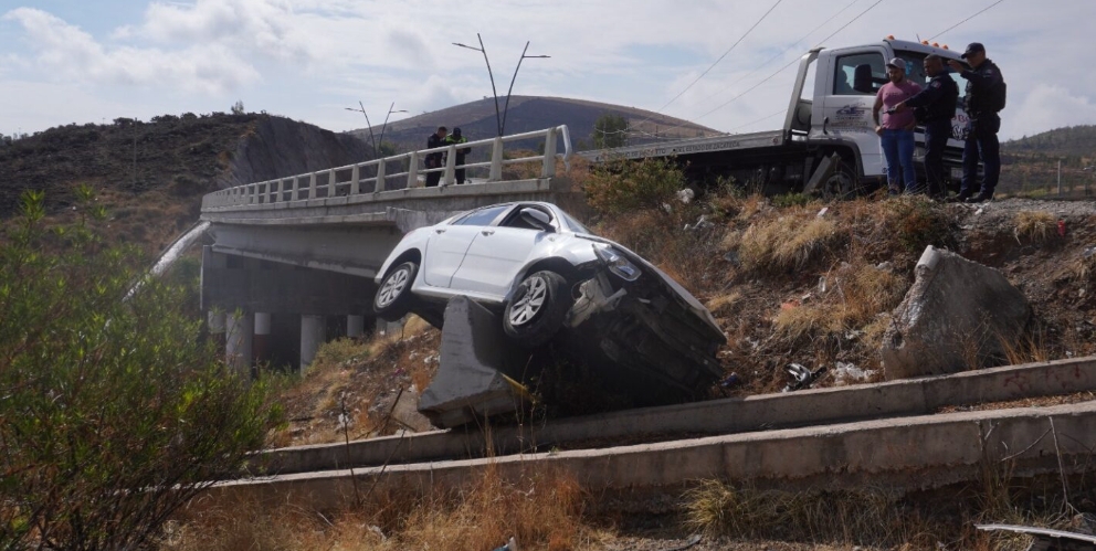 Según los reportes, la conductora perdió el control del vehículo al tomar una curva, impactándose contra el muro de contención. El fuerte golpe provocó que el auto saliera proyectado y cayera por un desnivel, quedando suspendido en una estructura metálica, lo que evitó que volcara por completo y sufriera daños aún más graves.