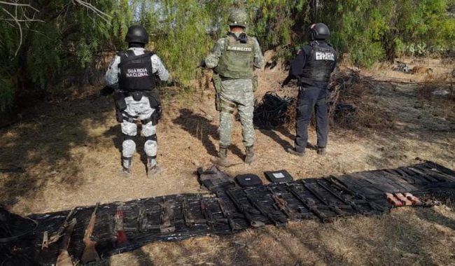 Los agentes realizaron reconocimientos terrestres y patrullajes de disuasión del delito en la localidad de Salinas de Hidalgo, en el municipio de Noria de Ángeles, donde se encontraba el arsenal en cuestión.