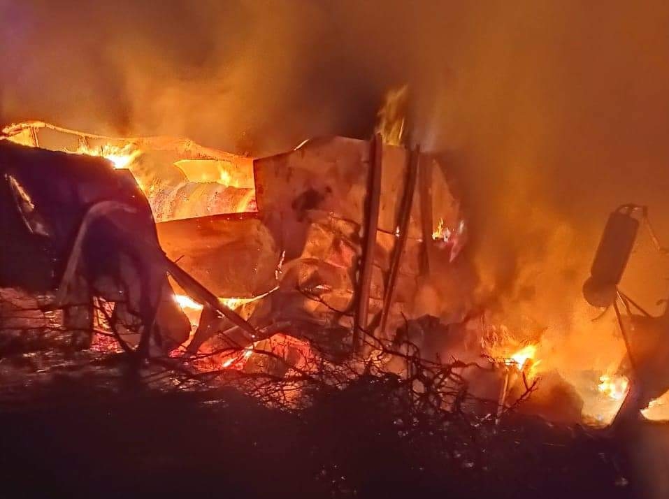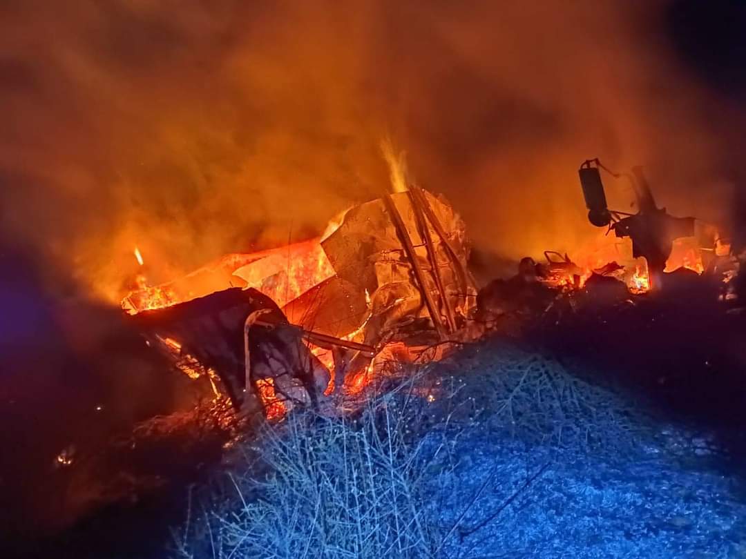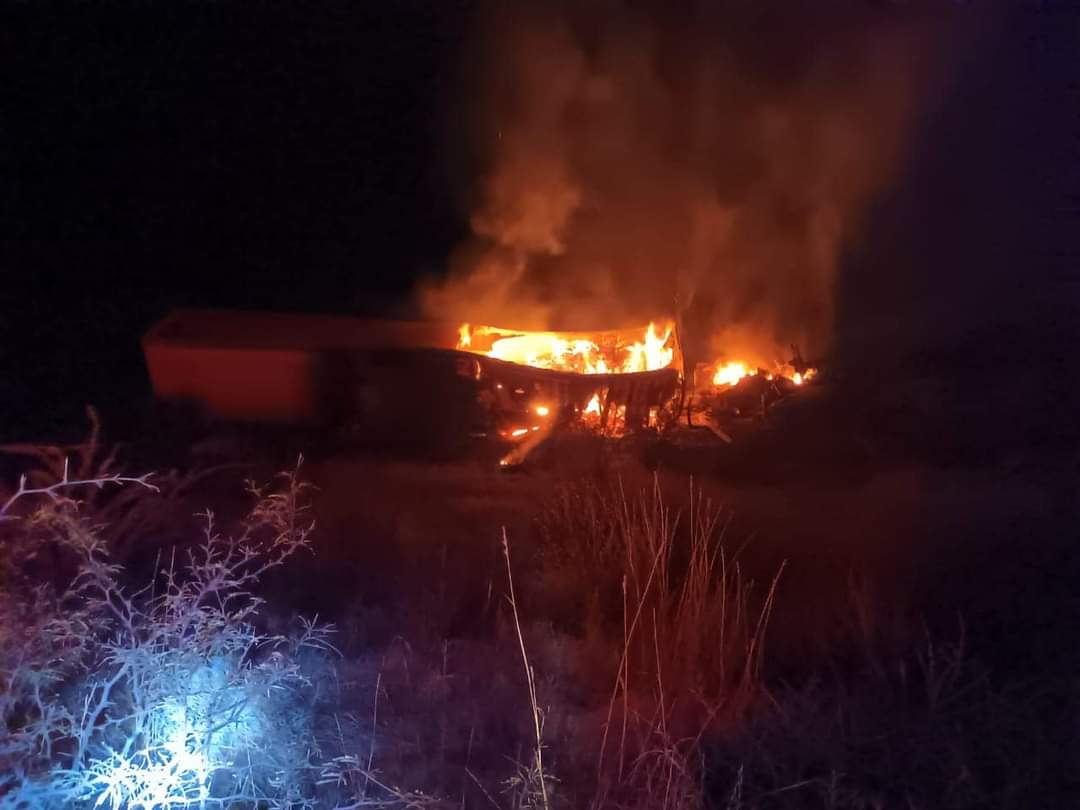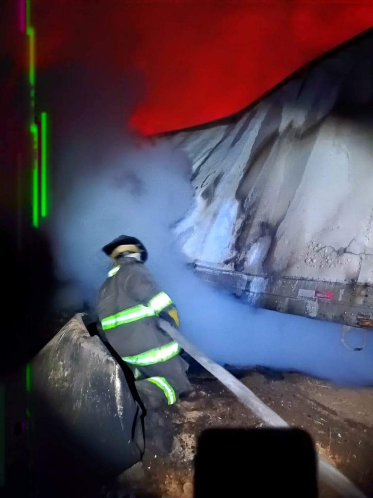 Accesozac- Zacatecas, Zac.- Personal de Bomberos, Rescate y Salvamento de Protección Civil Estatal atienden un accidente carretero de un tráiler de carga con salida de camino, choque e incendio reportándose perdída total del pesado camión.