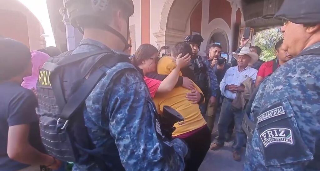 Encabezados por el secretario de seguridad pública, los uniformados trasladaron a las víctimas al patio de la presidencia municipal donde se reunieron con sus familiares