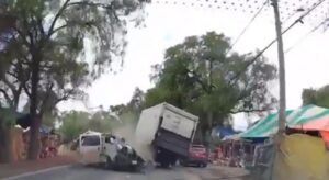 ESTADO DE MÉXICO. – Un video capturó el momento exacto en el que un tráiler invade el carril contrario, chocando y destrozando a una combi de pasajeros en Zumpango, en el Estado de México; el chofer se dio huyó del lugar después de provocar el aparatoso accidente. Accesozac. El hecho ocurrió el pasado 13 de … Sigue leyendo VIDEO: Trailer invade carril contrario y destroza combi de pasajeros