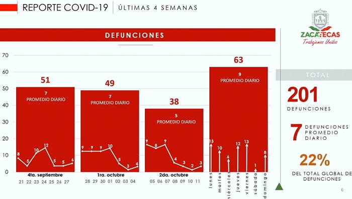 Por su parte el secretario de Salud, Gilberto Breña Cantú, alertó que esta situación podría provocar que la entidad regrese a color rojo del Semáforo Epidémico, lo que obliga a las autoridades a conocer cómo y dónde se deben reforzar las medidas de seguridad, principalmente en los municipios que presentan la más alta incidencia, como son Zacatecas, Guadalupe y Fresnillo.